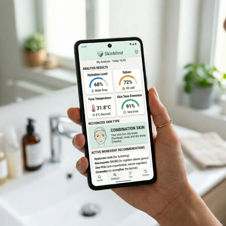 The SkinMind app translates measurements into a clear skin profile and personalized product recommendations.